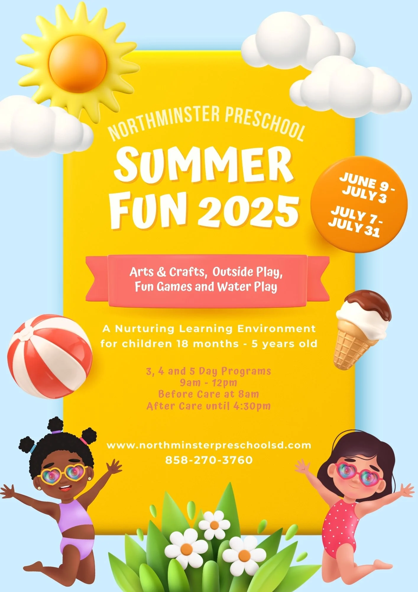 Our Summer Fun program is intended for our returning and existing students and for those newly enrolling in the Fall. Two 4 week sessions of fun water play with sprinklers, water tables, creative art projects, games and summer snacks. Half and Full day schedules are available for 3, 4 or 5 days a week.